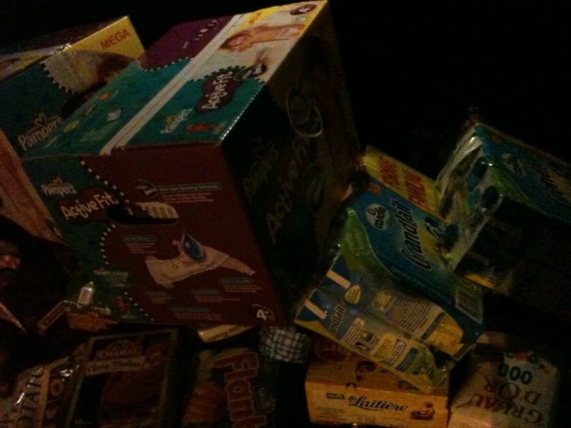 Faut dire qu’aussi, l’intérêt de cette entreprise finalement si éphémère m’échappe un peu, si ce n’est de faire rentrer après tout ce qui était dedans avant, ce qui semble parfois impossible de premier abord, mais comment font-ils. Bref toujours est-il que j’avais une fois de plus oublié mes cabas de ménagère écolo, et avec un sourire en m’imaginant l’Homme tout à son kif préféré, je fis de mon mieux.